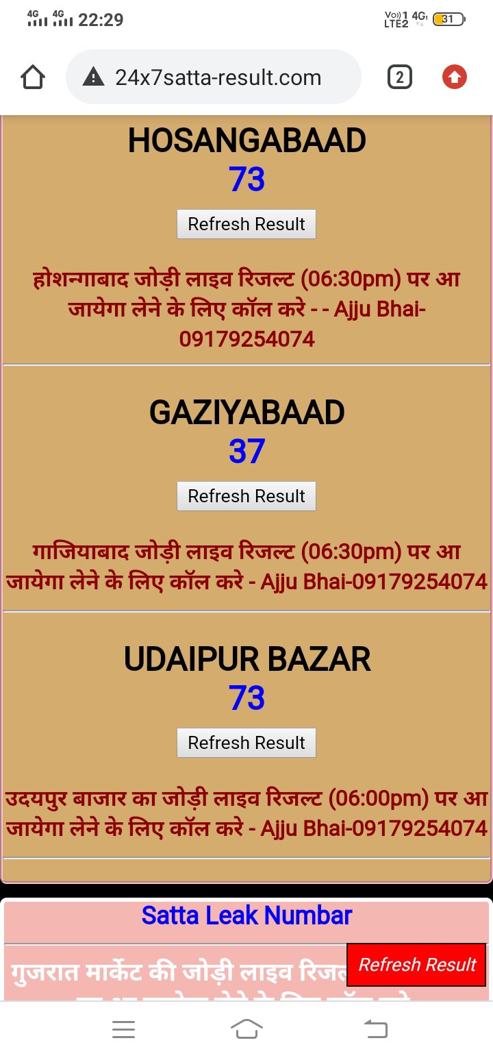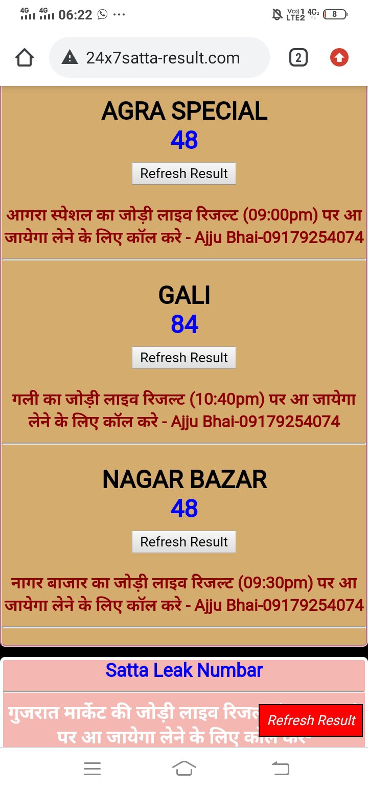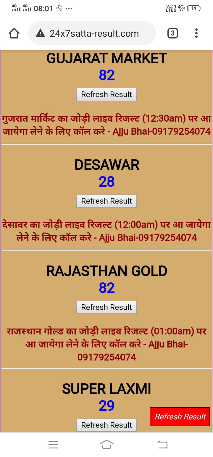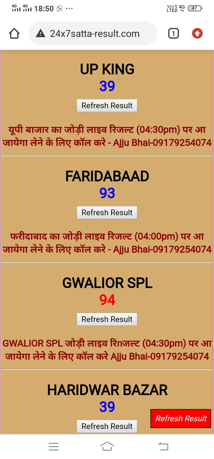 अगर आपको गुजरात मार्केट, राजस्थान गोल्ड, यूपी बाज़ार, फरीदाबाद, हरिद्वार बाज़ार, लखनऊ बाज़ार, उदयपुर, गाज़ियाबाद, शिमला बाज़ार, सुपर पंजाब, आगरा स्पेशल, गली, हरी ओम, जयपुर ,गाज़ियाबाद ,देसावर ,नोइडा बाज़ार ,राजस्थान गोल्ड का ओपन का लाइव रिजल्ट 1 घंटे पहले चाहिए तो कॉल करे-ajju Bhai-09179254074