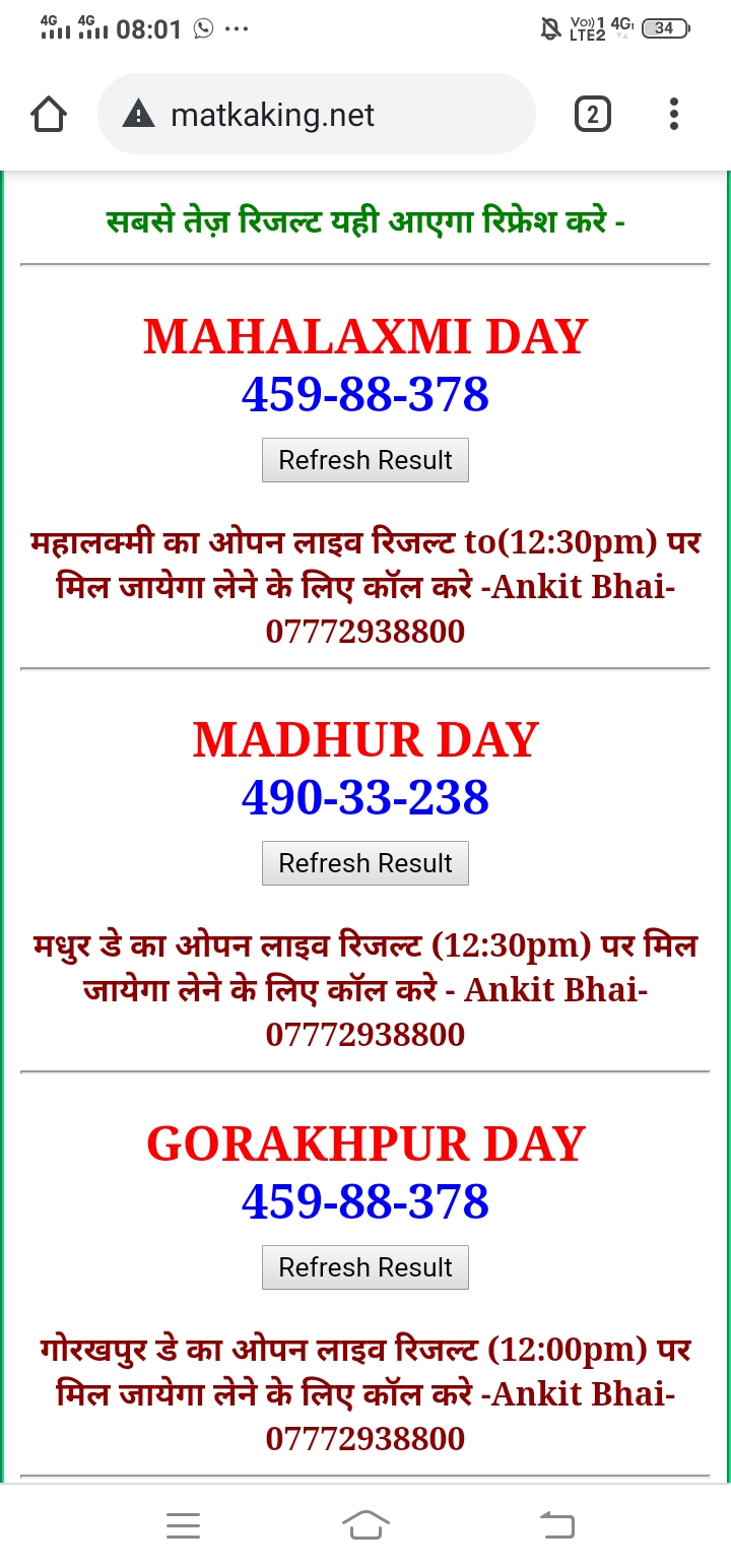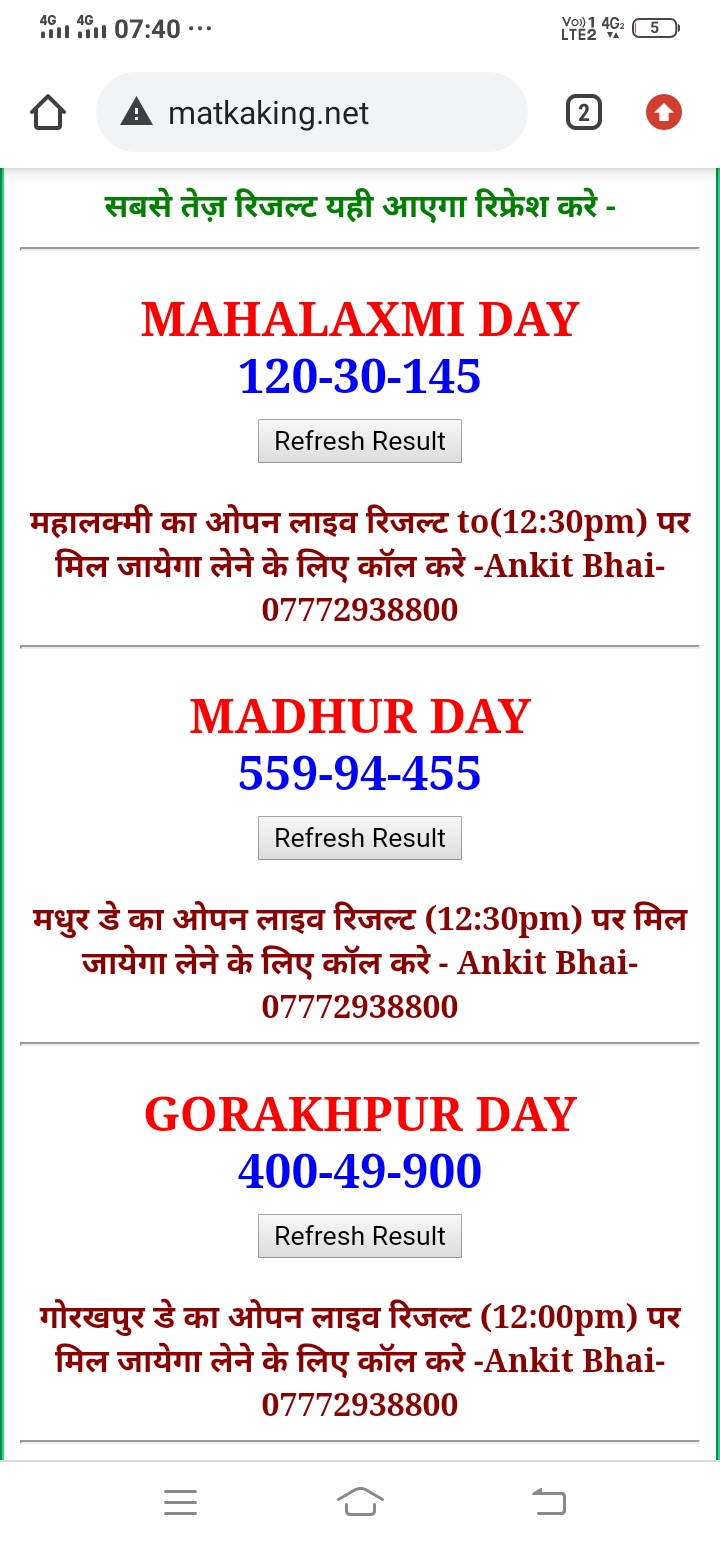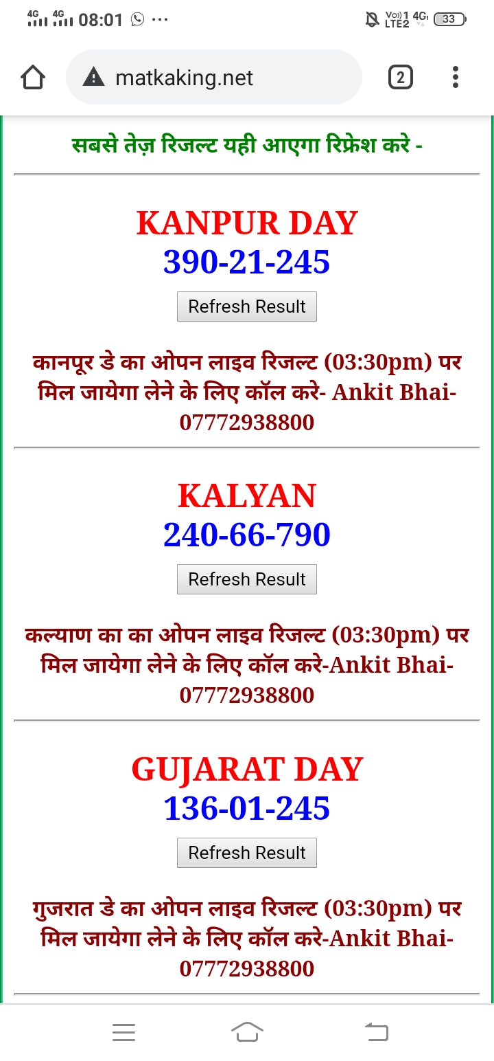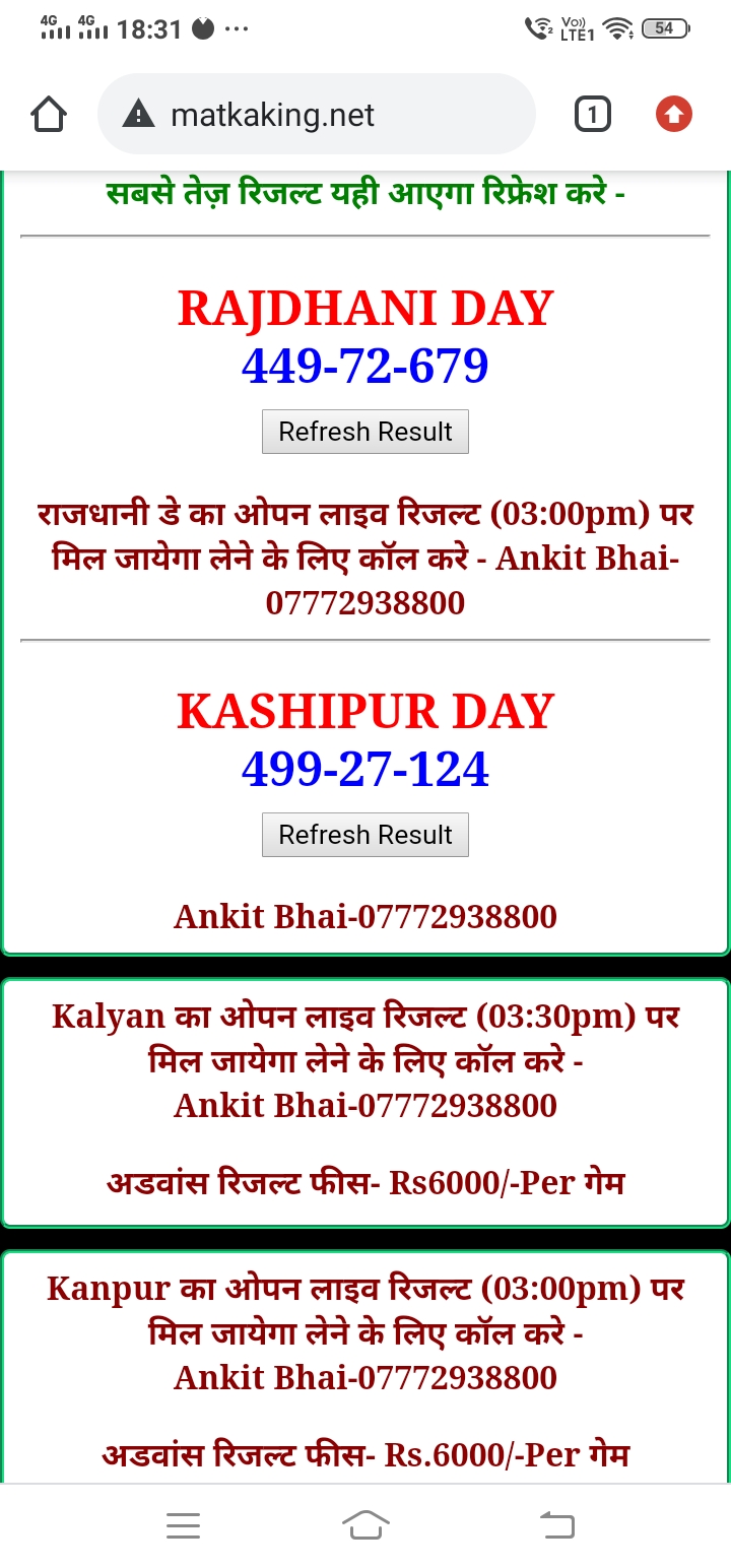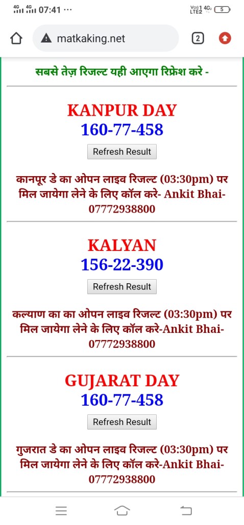 दोस्तों अगर आपको कल्याण, टाइम बाजार, मधुर डे ,मिलन डे, राजधानी डे, महालक्ष्मी डे, गोरखपुर डे ,जयपुर डे , कानपुर डे , गुजरात डे , राजकोट डे, काशीपुर डे , ओपन लाइव रिजल्ट 30 मिनट पहले लेने के लिए कॉल करे -अंकित भाई -7772938800