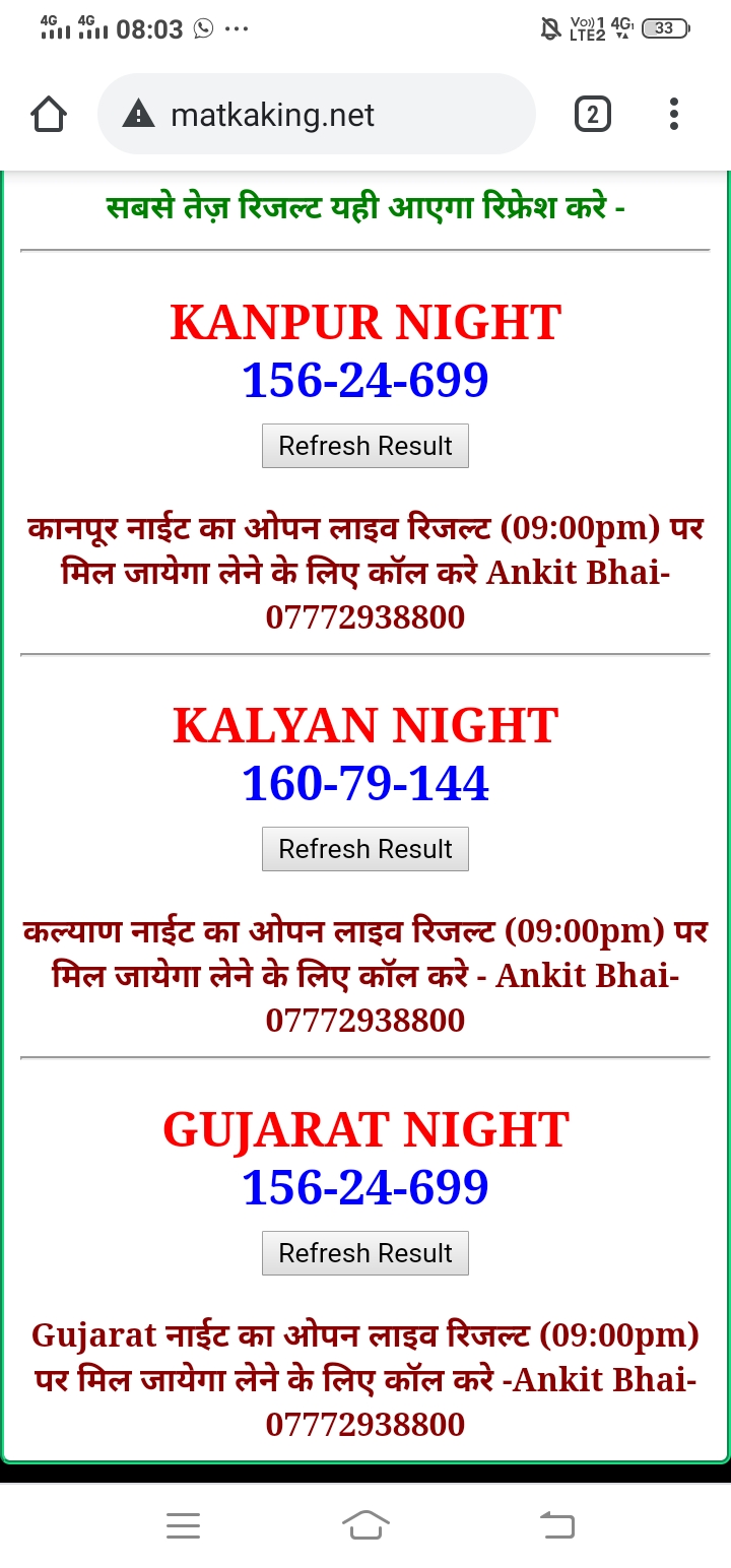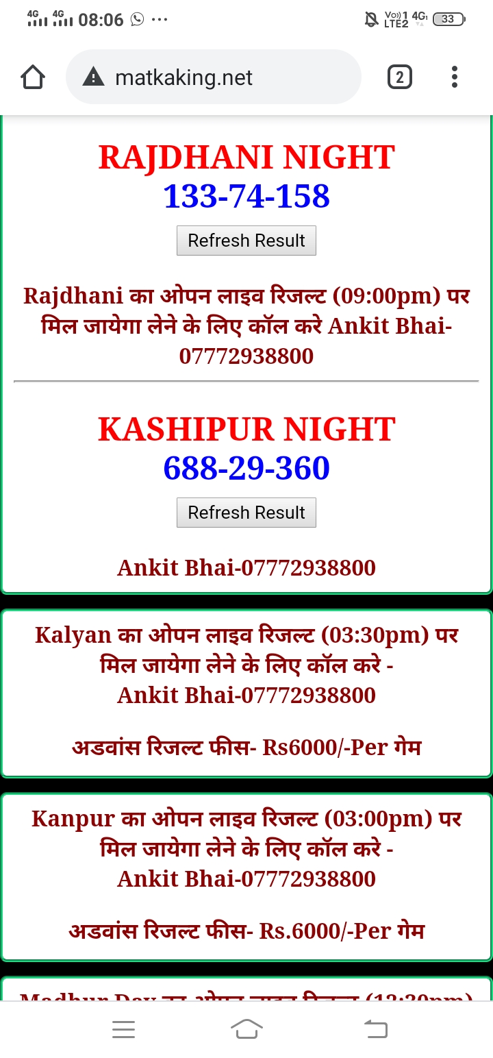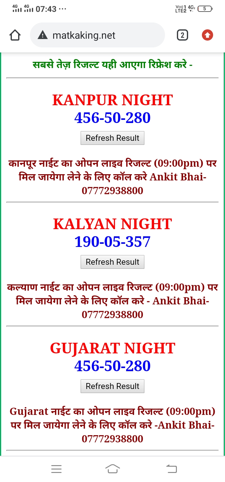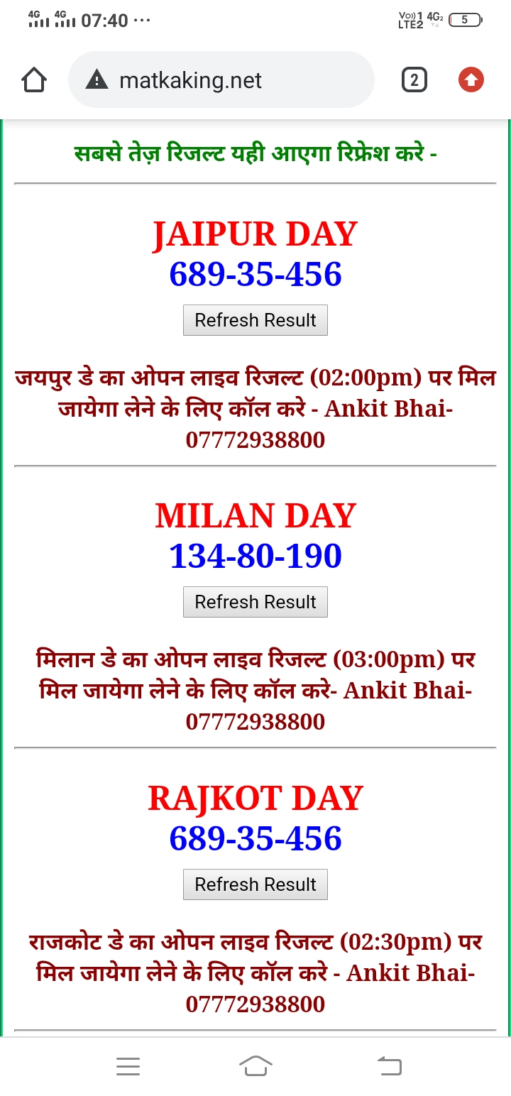 दोस्तों अगर आपको कल्याण, टाइम बाजार, मधुर डे ,मिलन डे, राजधानी डे, महालक्ष्मी डे, गोरखपुर डे ,जयपुर डे , कानपुर डे , गुजरात डे , राजकोट डे, काशीपुर डे , ओपन लाइव रिजल्ट 30 मिनट पहले लेने के लिए कॉल करे -अंकित भाई -7772938800