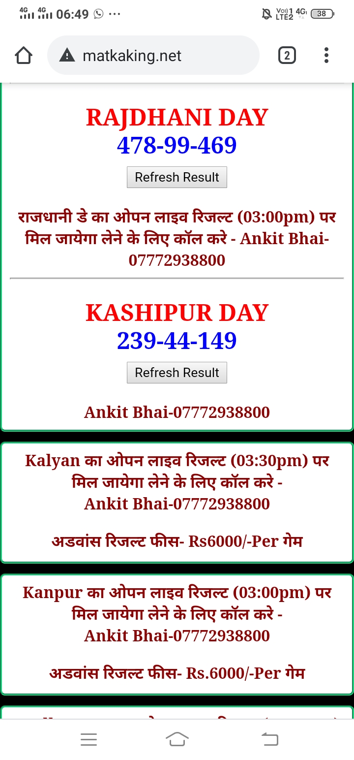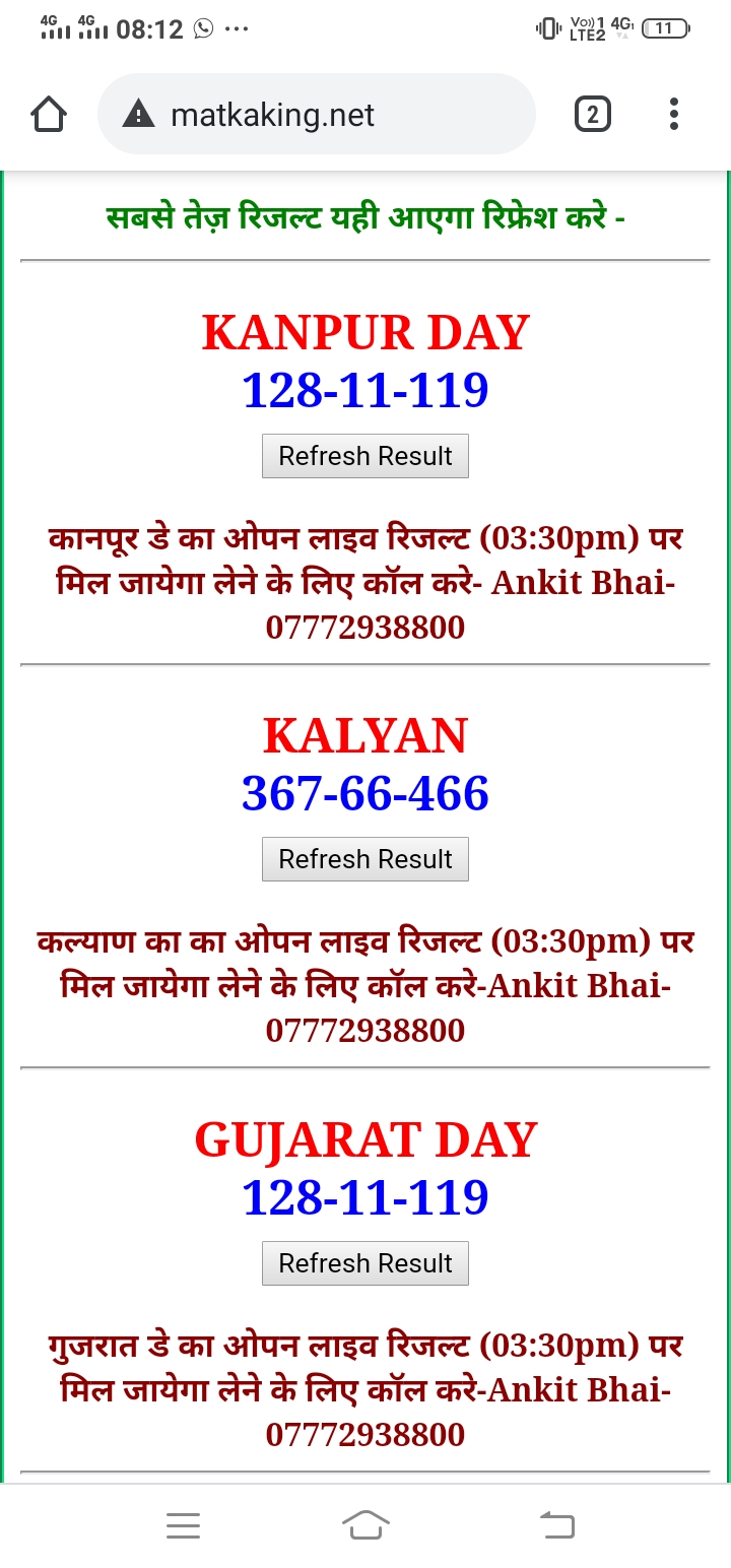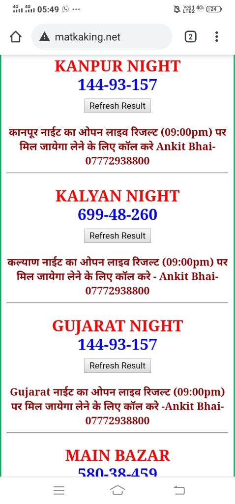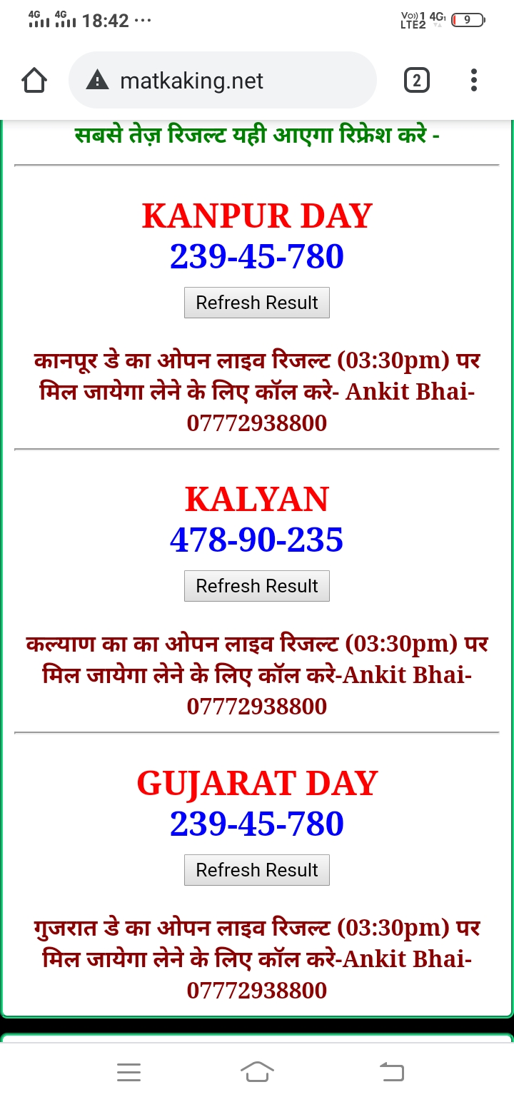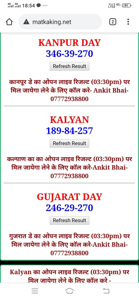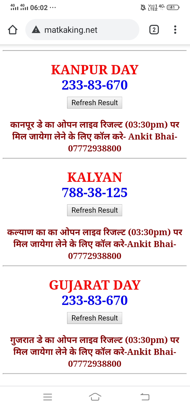 दोस्तों अगर आपको कल्याण, टाइम बाजार, मधुर डे ,मिलन डे, राजधानी डे, महालक्ष्मी डे, गोरखपुर डे ,जयपुर डे , कानपुर डे , गुजरात डे , राजकोट डे, मेन बाजार कल्याण नाइट काशीपुर डे , ओपन लाइव रिजल्ट 30 मिनट पहले लेने के लिए कॉल करे -अंकित भाई -7772938800