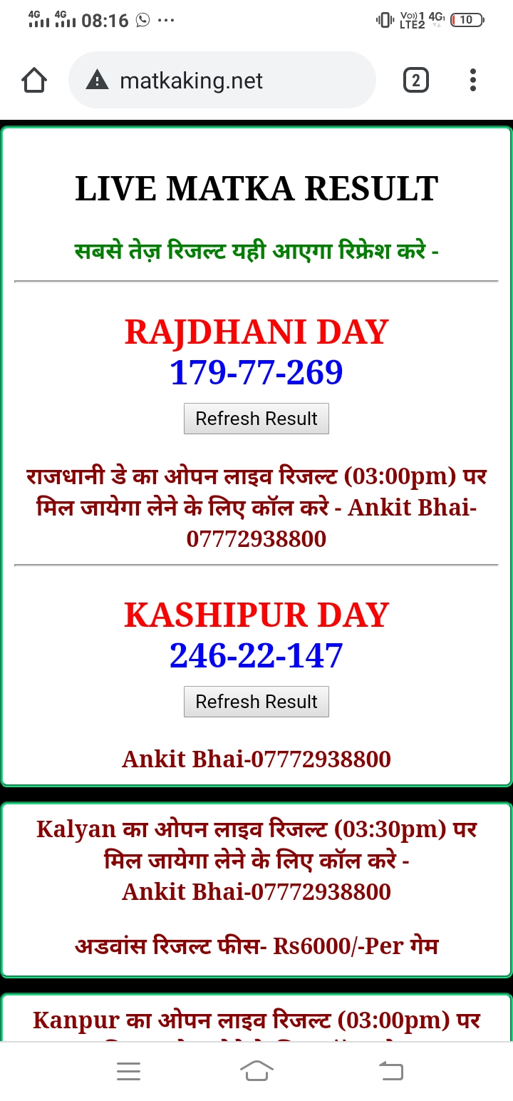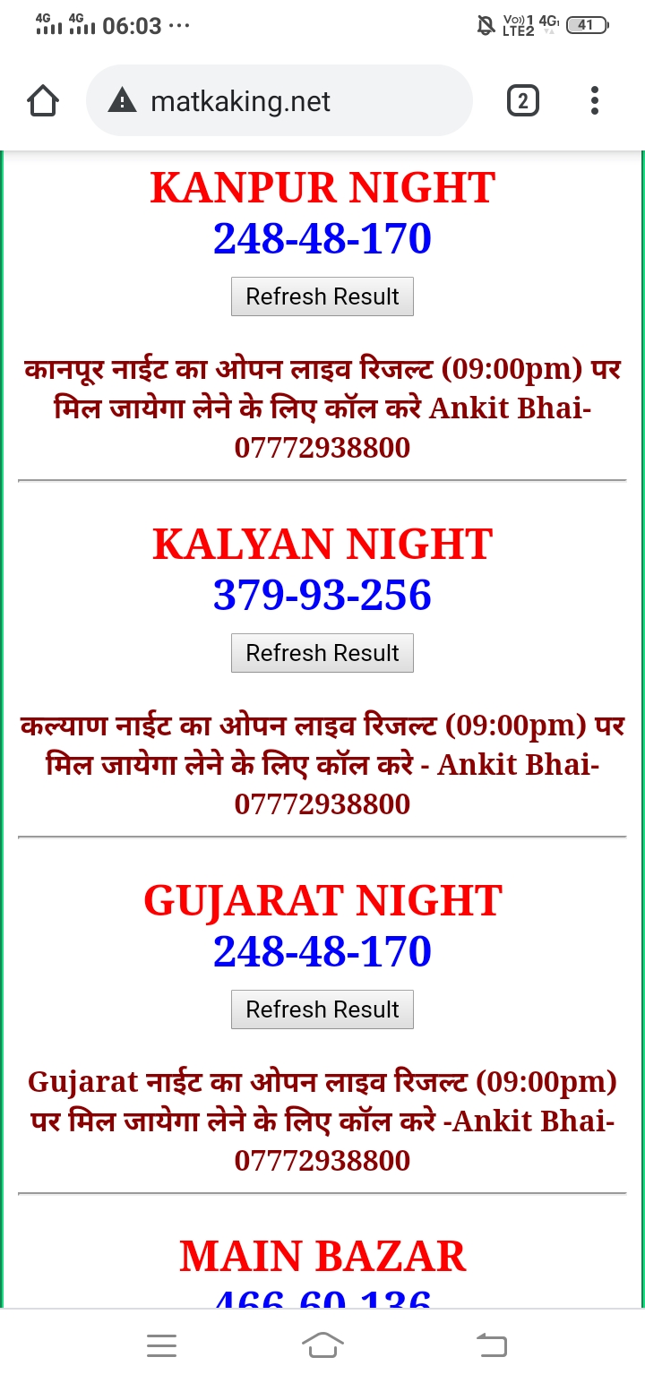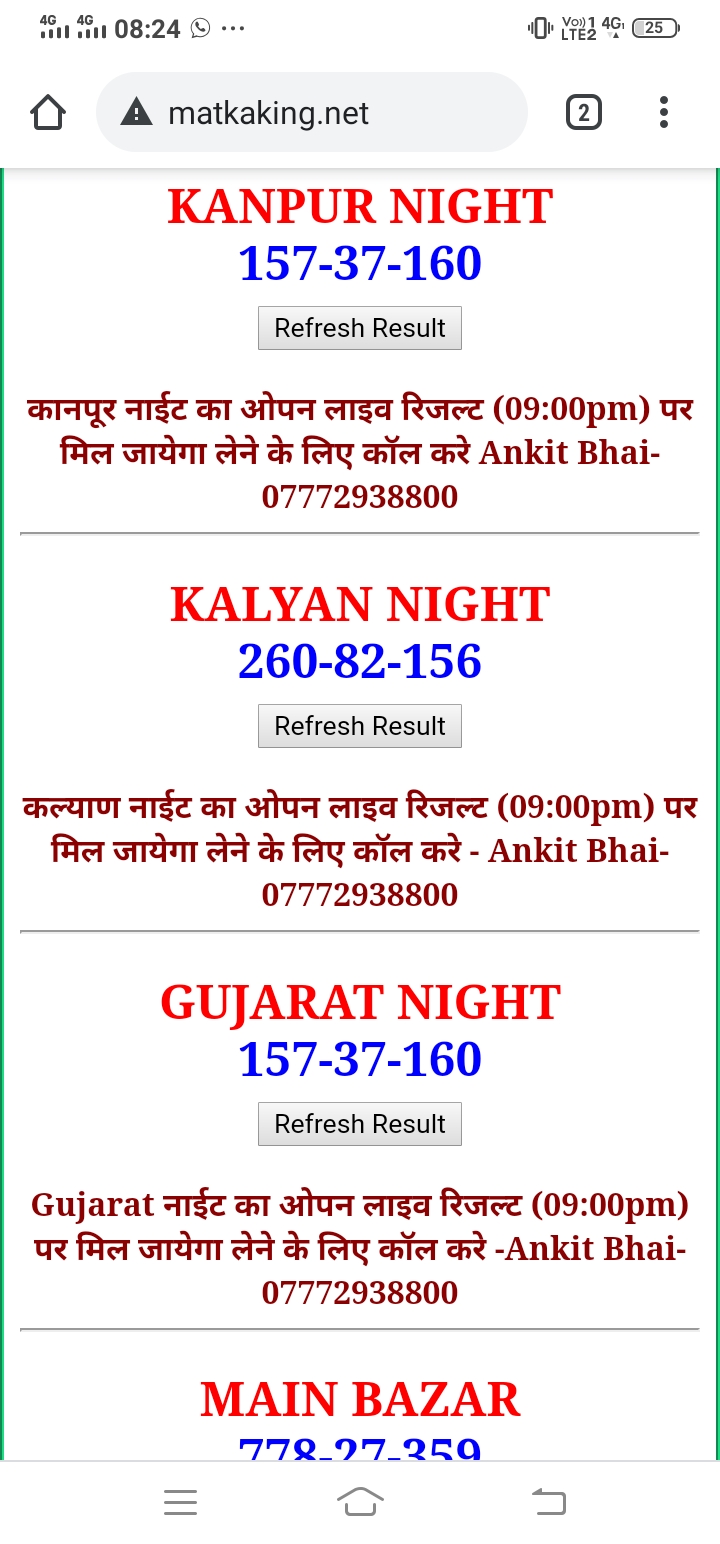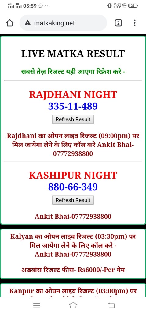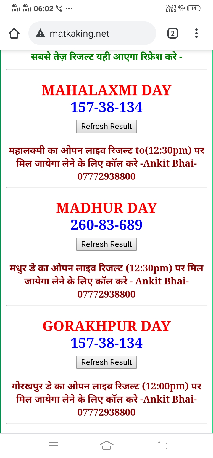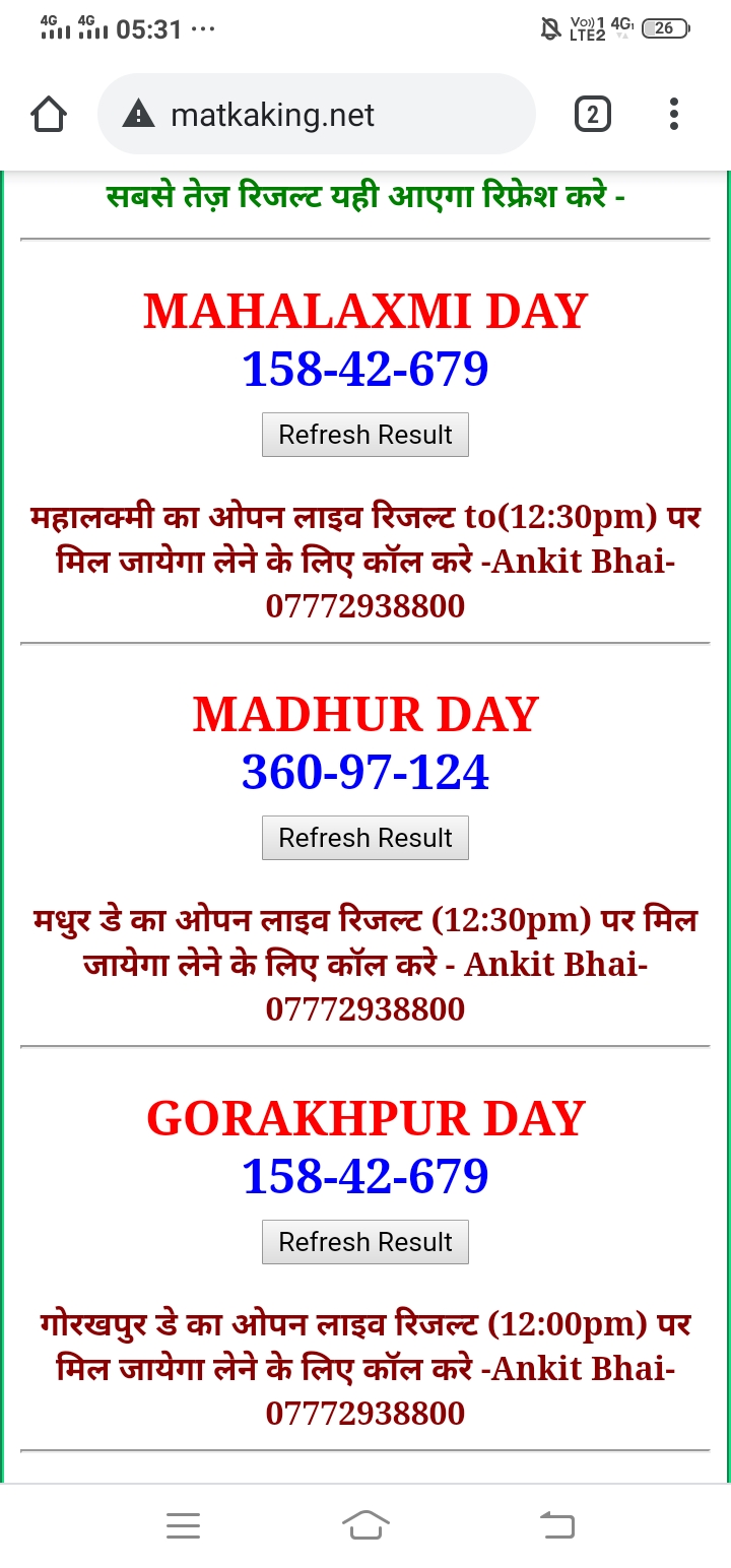 दोस्तों अगर आपको कल्याण, टाइम बाजार, मधुर डे ,मिलन डे, राजधानी डे, महालक्ष्मी डे, गोरखपुर डे ,जयपुर डे , कानपुर डे , गुजरात डे , राजकोट डे, मेन बाजार कल्याण नाइट काशीपुर डे , ओपन लाइव रिजल्ट 30 मिनट पहले लेने के लिए कॉल करे -अंकित भाई -7772938800