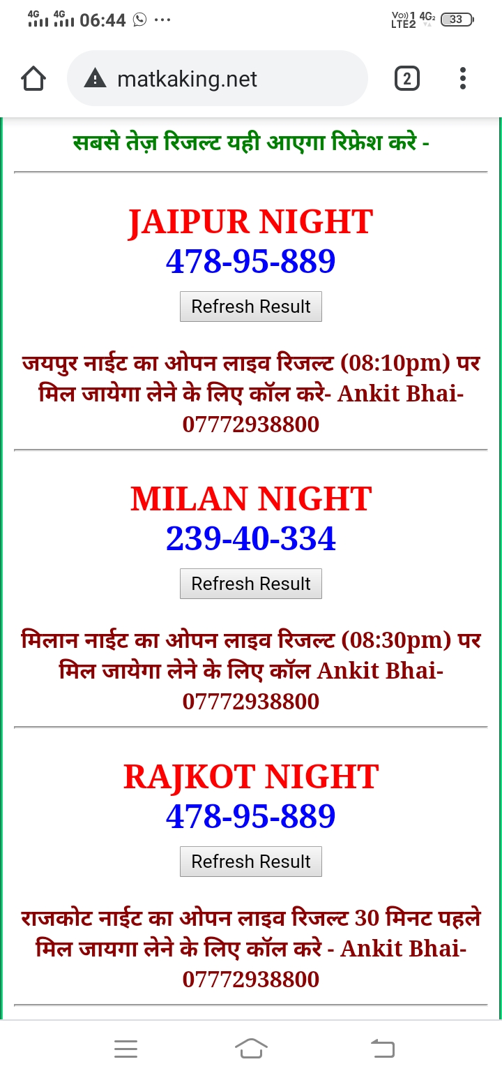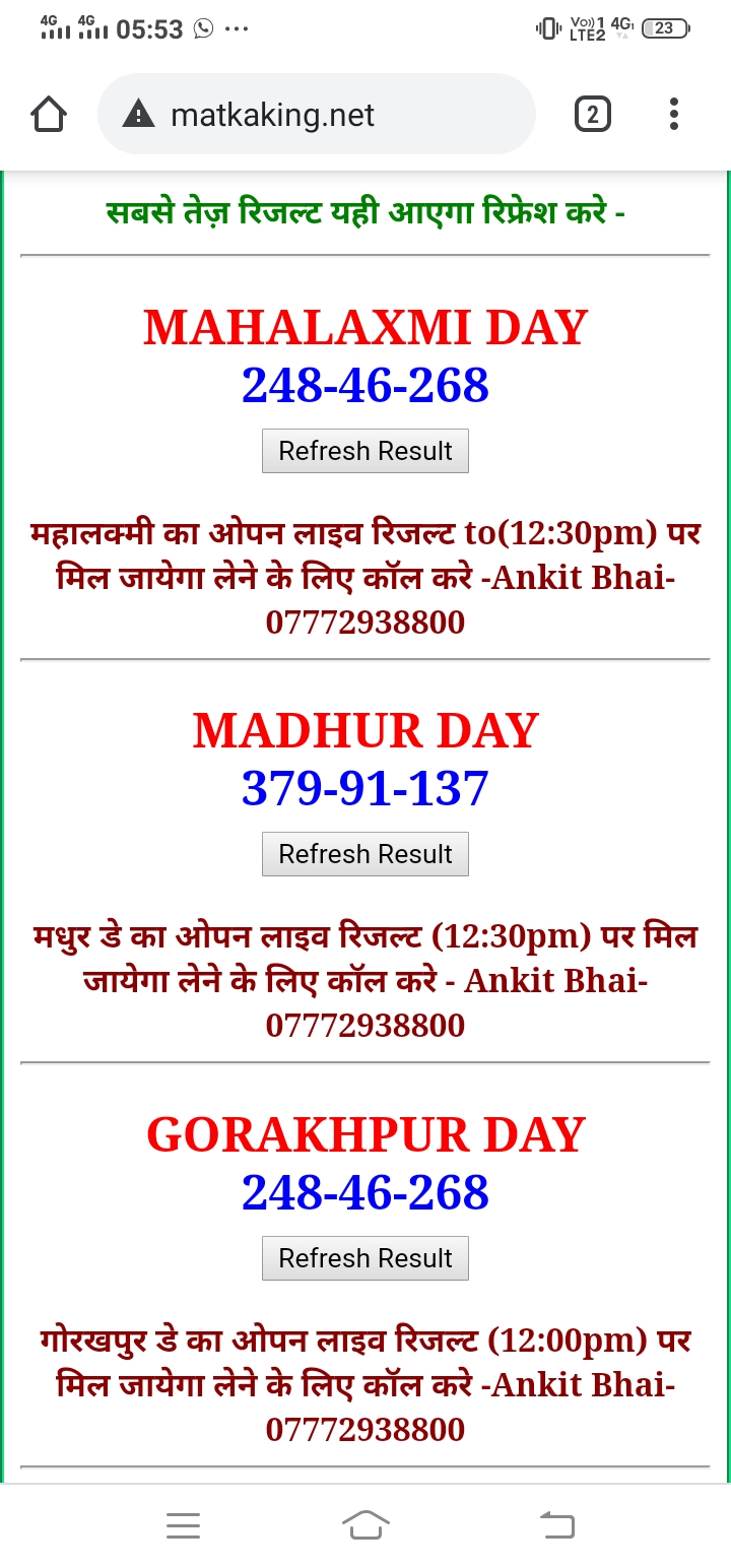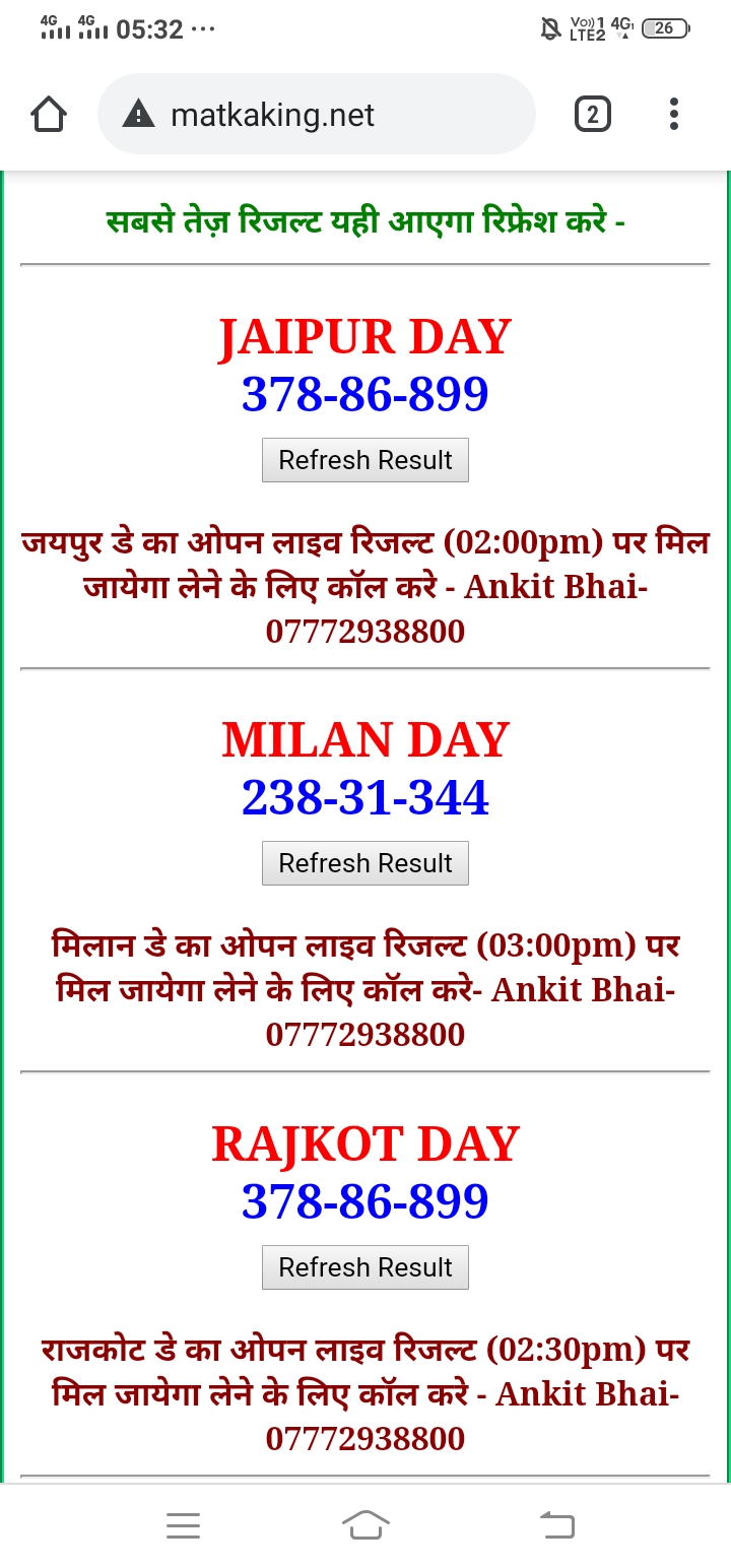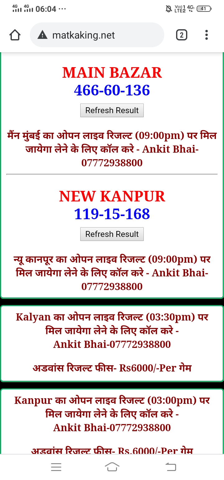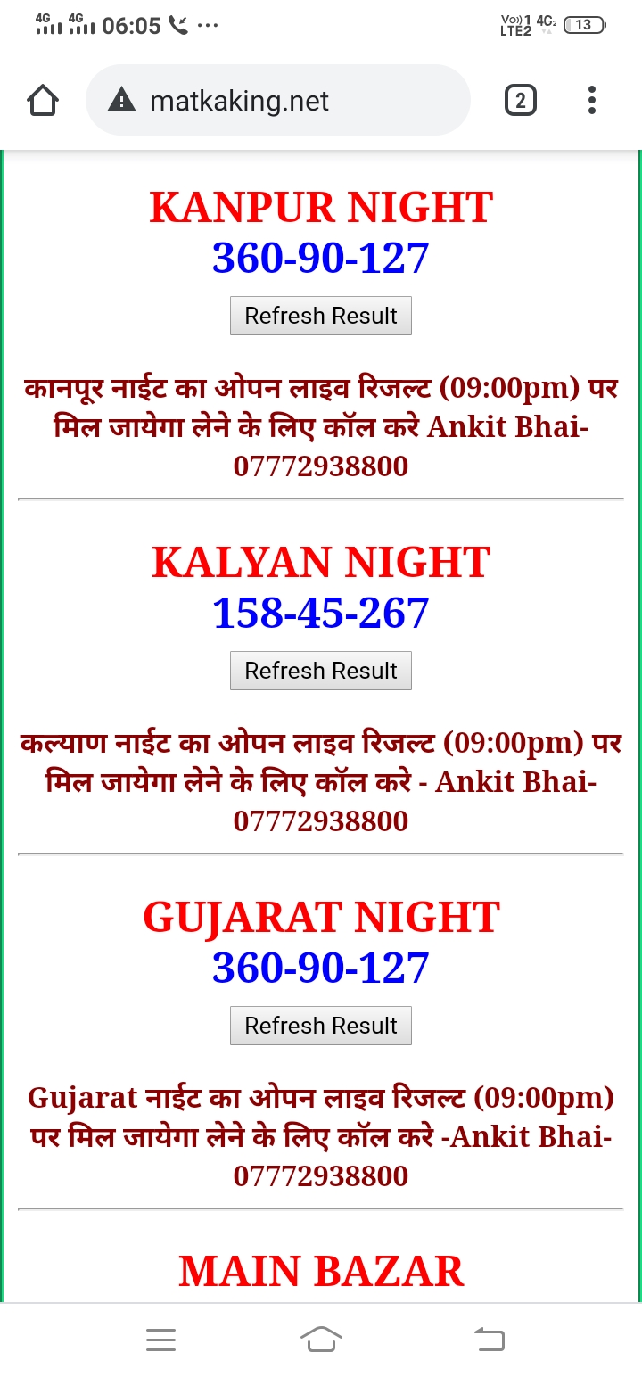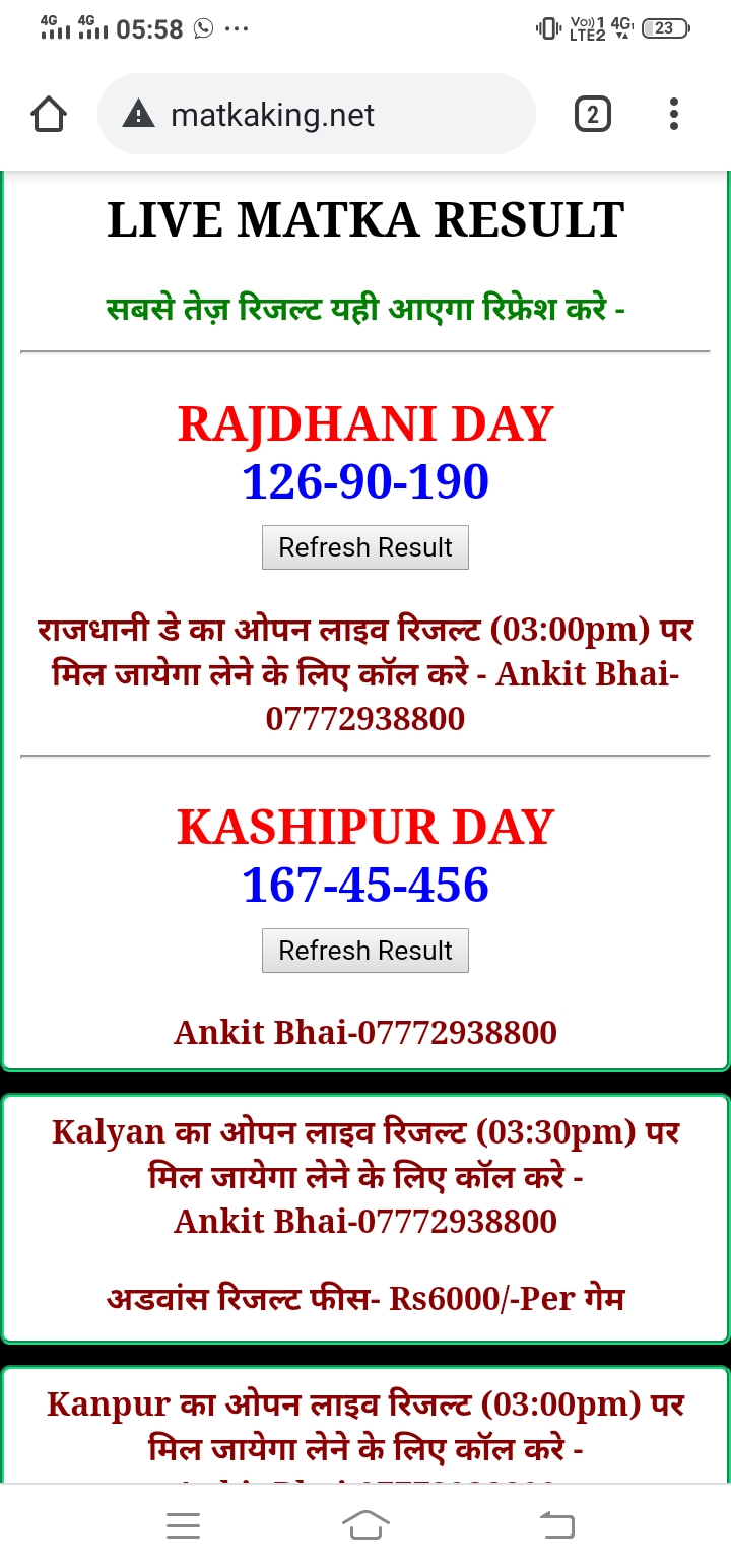 दोस्तों अगर आपको कल्याण, टाइम बाजार, मधुर डे ,मिलन डे, राजधानी डे, महालक्ष्मी डे, गोरखपुर डे ,जयपुर डे , कानपुर डे , गुजरात डे , राजकोट डे, मेन बाजार कल्याण नाइट काशीपुर डे , ओपन लाइव रिजल्ट 30 मिनट पहले लेने के लिए कॉल करे -अंकित भाई -7772938800