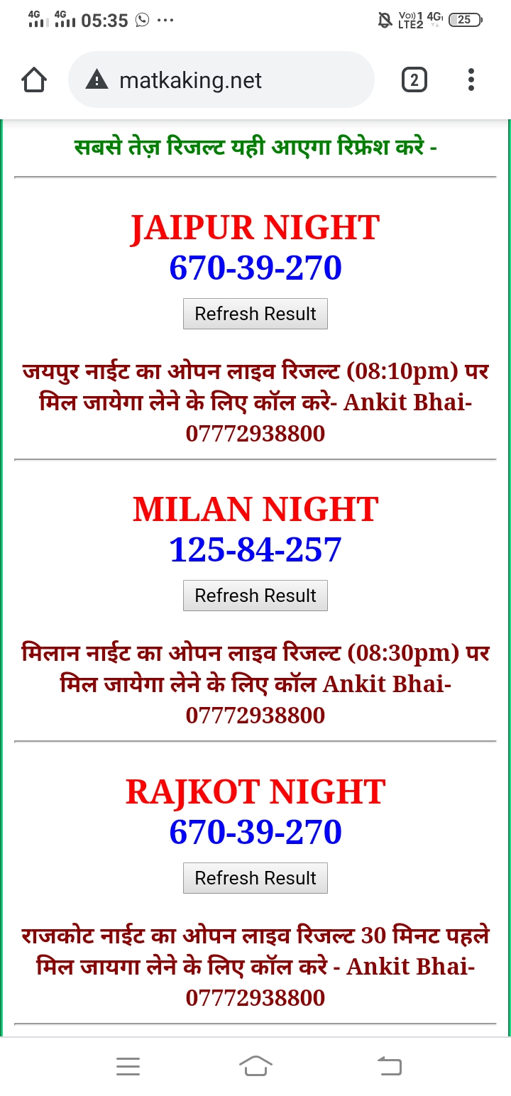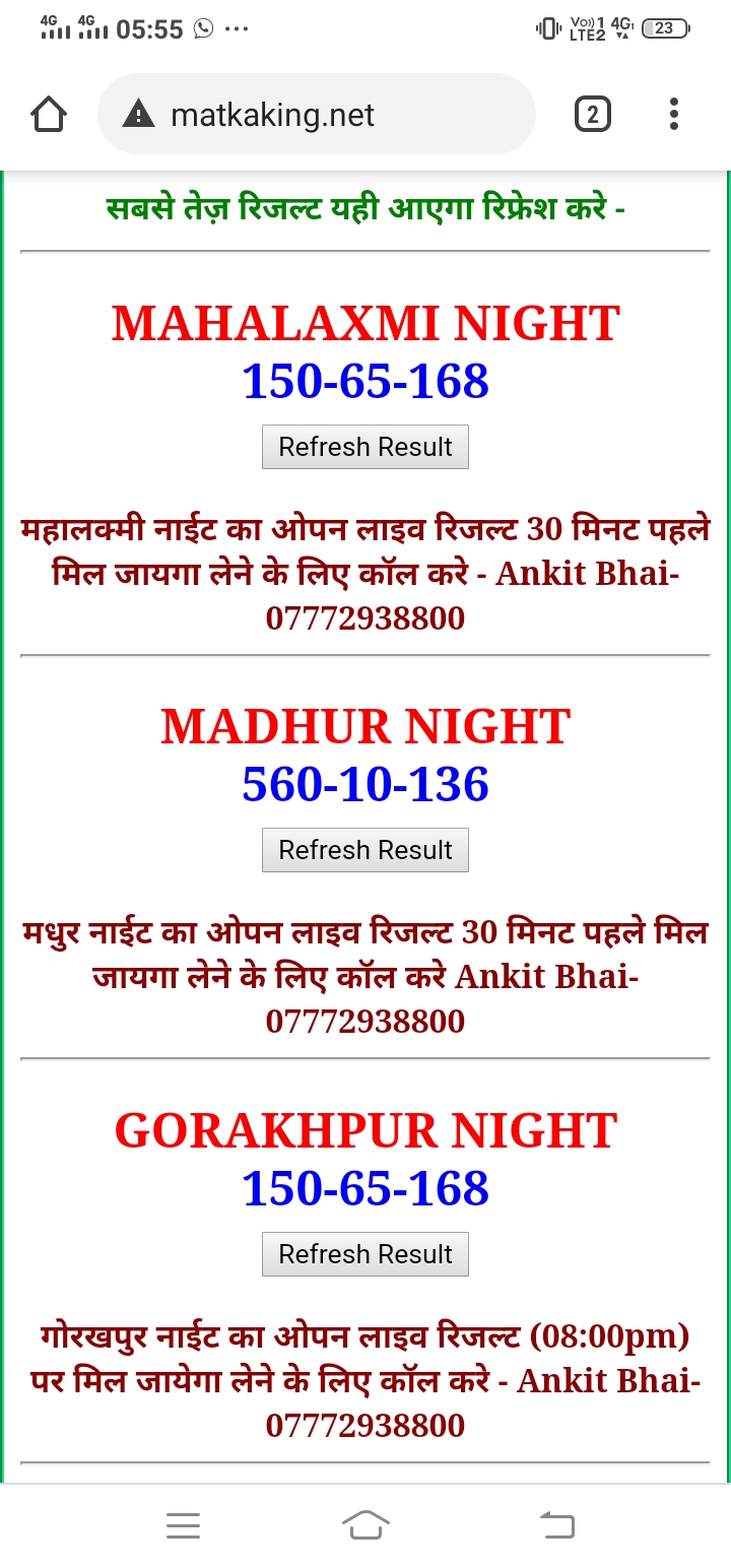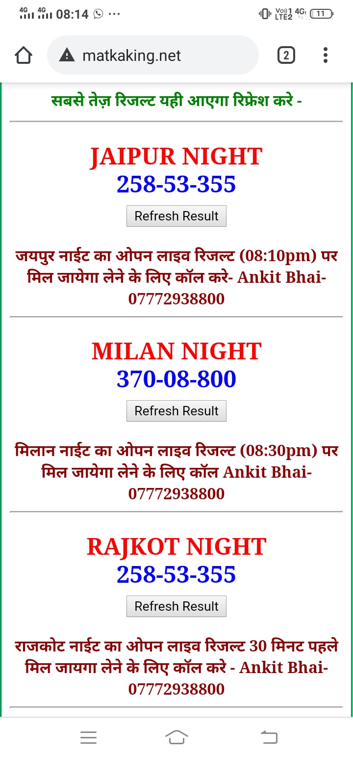 कल्याण , मिलान डे , मधुर डे , कानपूर डे , जयपुर डे , टाइम बाजार ,मधुर मॉर्निंगार , महालक्मी डे कल्याण नाईट , मिलान नाईट , राजधानी डे , मधुर नाईट , जयपुर नाईट , कानपूर नाईट , राजधानी नाईट , महालक्मी नाईट ,मैन बाज़ार,ओपन लाइव रिजल्ट 30 मिनट पहले लेने के लिए कॉल करे (Ankit Bhai-07772938800)