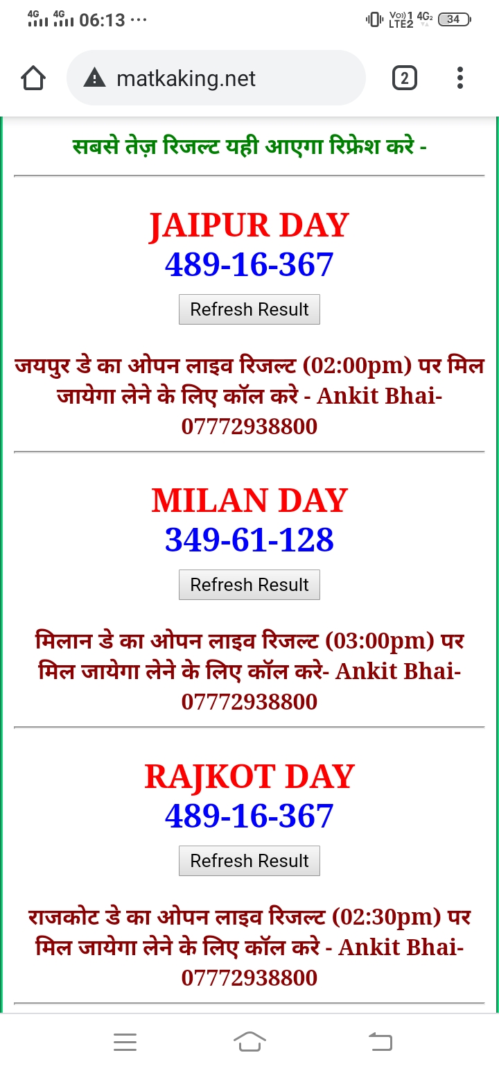 दोस्तों अगर आपको कल्याण, टाइम बाजार, मधुर डे ,मिलन डे, राजधानी डे, महालक्ष्मी डे, गोरखपुर डे ,जयपुर डे , कानपुर डे , गुजरात डे , राजकोट डे, काशीपुर डे , ओपन लाइव रिजल्ट 30 मिनट पहले लेने के लिए कॉल करे -अंकित भाई -7772938800